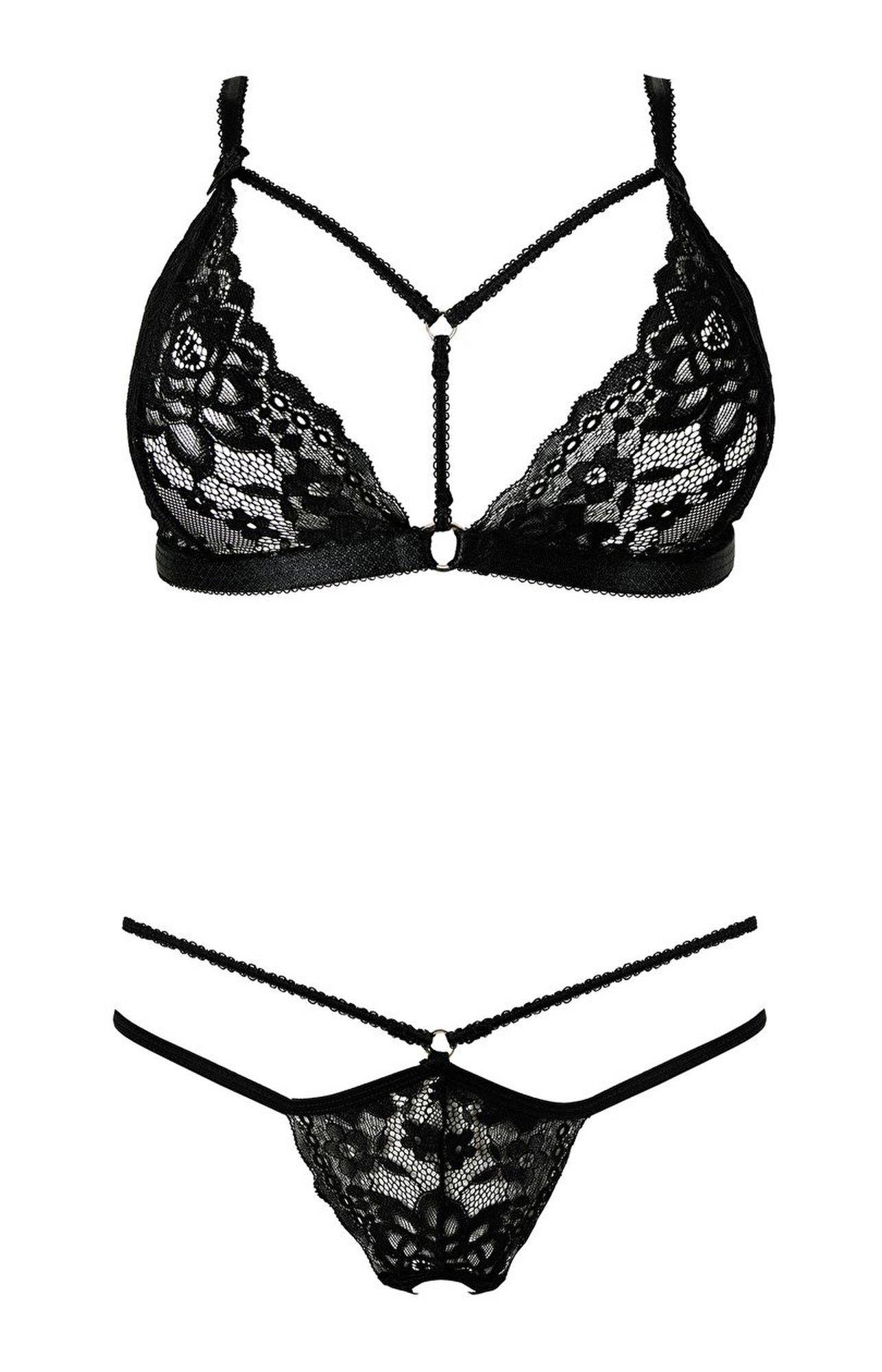 – kuszący komplet- wykonany z czarnej koronki i elastycznych paseczków- miękkie miseczki z ozdobnymi paskami na dekolcie- regulowane ramiączka i szerokość pod biustem- stringi z odważnym wycięciem w kroku