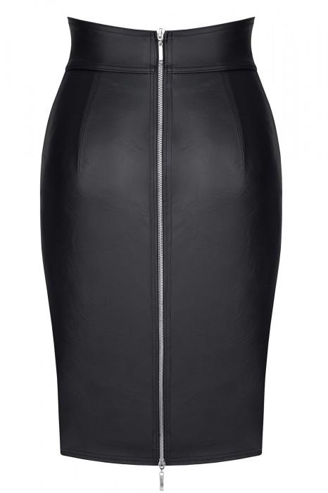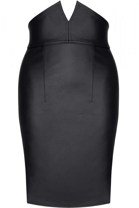 Efektowna i elegancka spódnica. Pięknie podkreśla i modeluje talię oraz krągłości bioder.Z przodu w górnej części, wizualnie efektowne wykończenie w kształcie trójkąta.Z tyłu pięknie prezentują się okrągłe pośladki. Długi srebrny ekspres odpinany zarówno z góry jak i z dołu. Wygląda atrakcyjnie, a co najważniejsze gorąco zaprasza do zmysłowych prowokacji.Spódnica w całości została wykonana z czarnej, elastycznej ekoskóry z fakturą prawdziwej skóry. Jest miła w dotyku i wspaniale dopasowuje się do ciała.Doskonale pasuje m.in. do topu BRZita001 – widocznego na zdjęciach.Kolor: czarnyRozmiary: S,M,L,XL,XXLSkład surowcowy: 95% poliester / 5% elastan