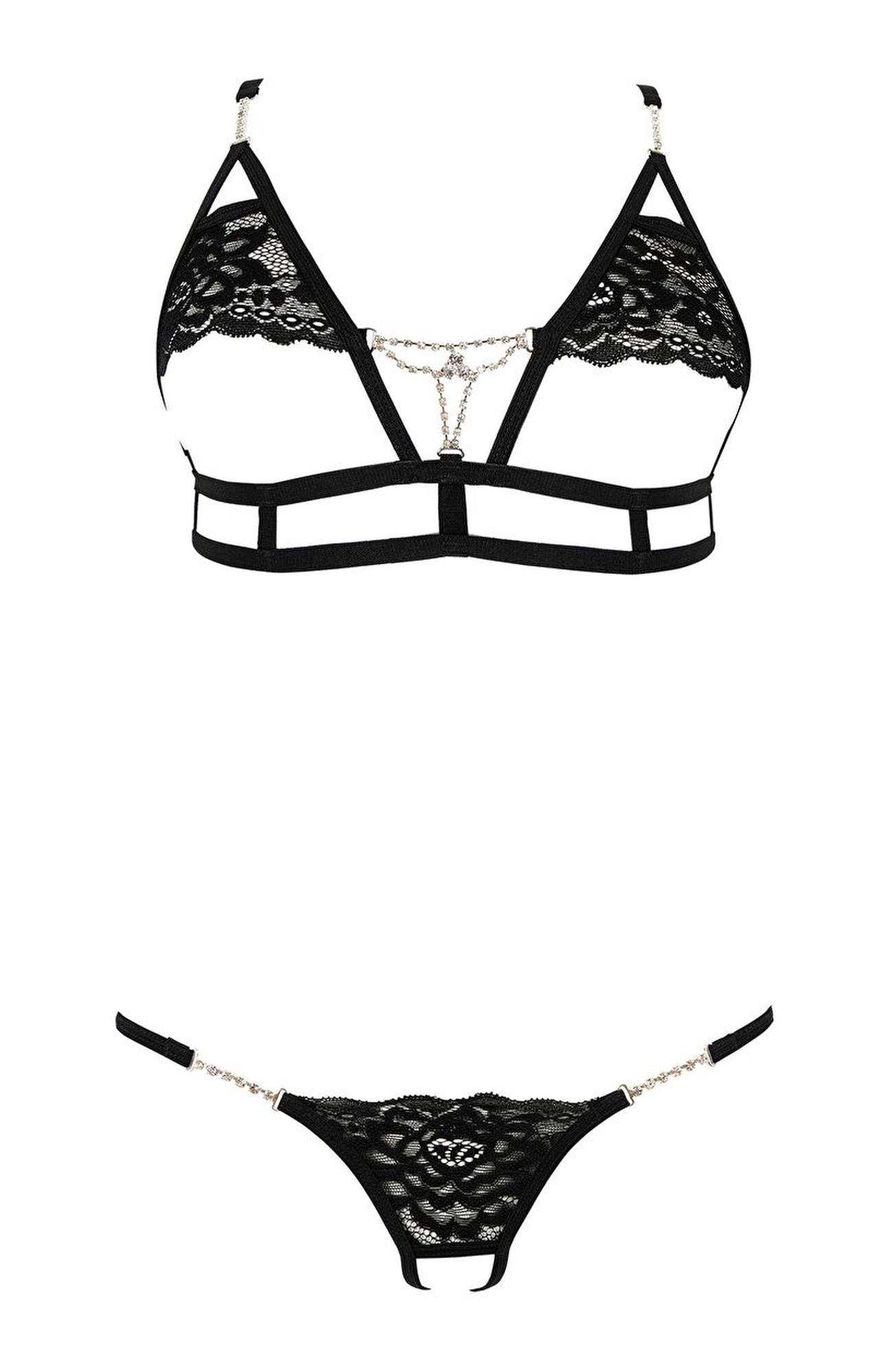 – kipiący seksem komplet- wykonany z czarnej koronki i elastycznych paseczków- otwarte miseczki z ozdobnymi cyrkoniami pomiędzy- regulowane ramiączka i szerokość pod biustem- stringi z odważnym wycięciem w kroku