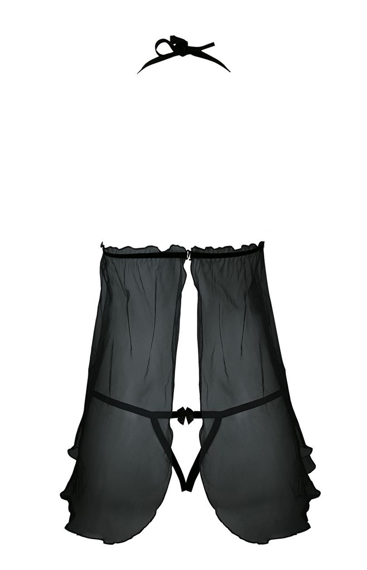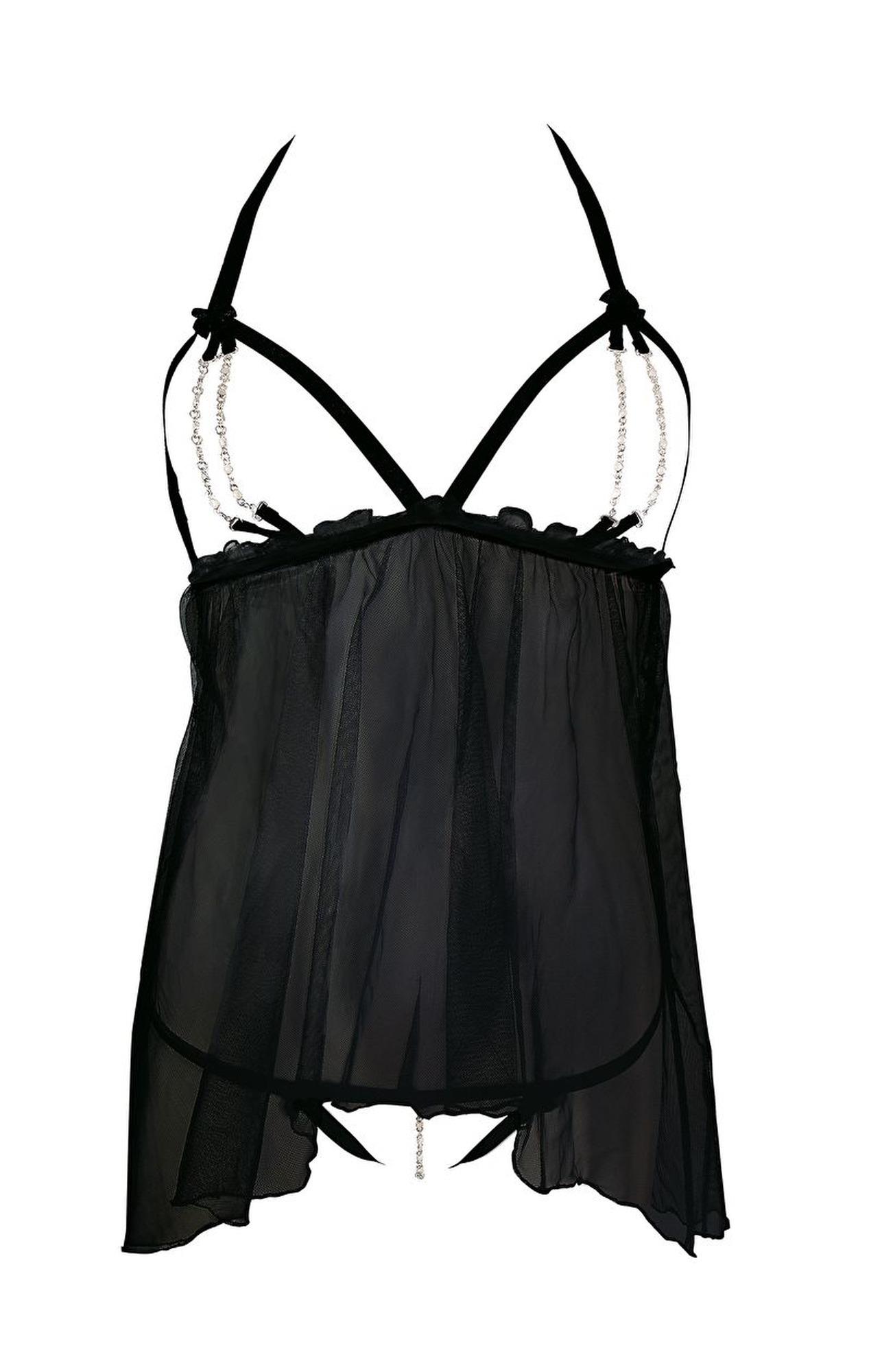 – prowokująca koszulka- wykonana z czarnej, transparentnej tkaniny- otwarte miseczki ozdobione biżuteryjnymi łańcuszkami- ramiączka wiązane na szyi- w komplecie kuse stringi z łańcuszkiem