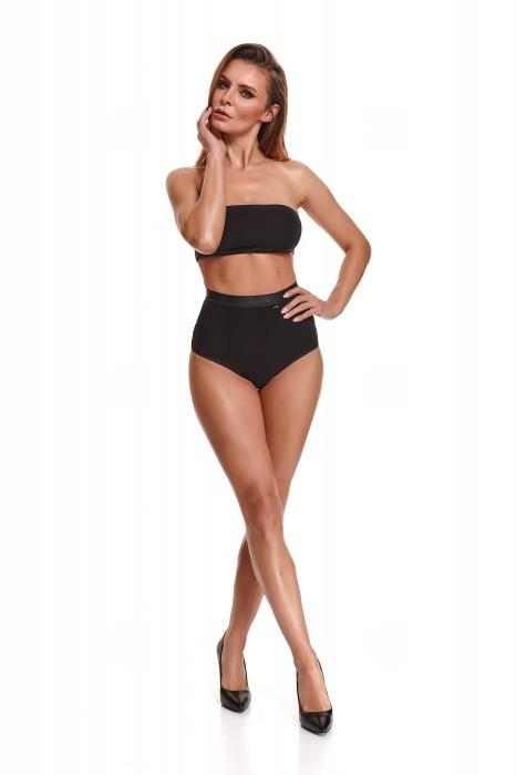 Komplet 2-u częściowy, tchnący subtelną zmysłowością. Wykonany z czarnego, elastycznego materiału, który doskonale dopasowuje się do ciała. Jest także bardzo miły w dotyku. Biustonosz z przodu z miękką miseczką, a z tyłu 2 paski miłej w dotyku, czarnej gumki. Szorty z podwyższonym stanem, atrakcyjnie wysoko profilowane na pośladkach w celu podkreślenia ich krągłości. W pasie z szeroką, miła w dotyku, czarną gumką. Kolor: black. Rozmiary: S,M,L,XL,XXL. Skład surowcowy: 95% poliester / 5% elastan