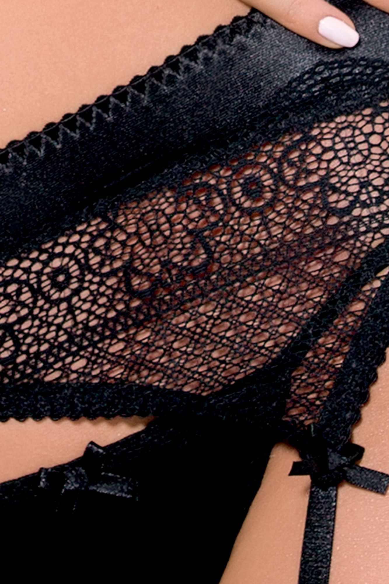 Trzyczęściowy komplet wykonany z czarnej satyny oraz delikatnej koronki.- regulowane ramiączka- specjalna guma ramiączkowa jak przy stanikach- regulowane zapięcia do pończoch- pas wiązany z tyłu- stringi w komplecie- produkt nie uczula- nie odbarwia się- nie farbuje przy praniu