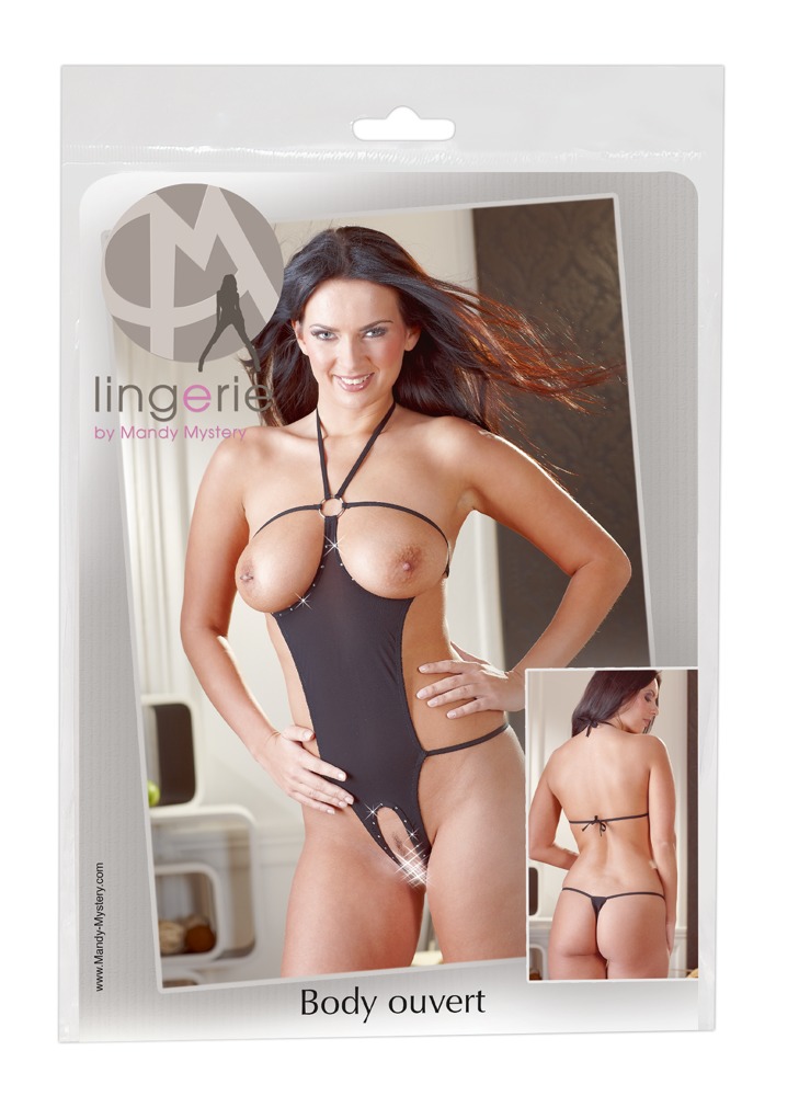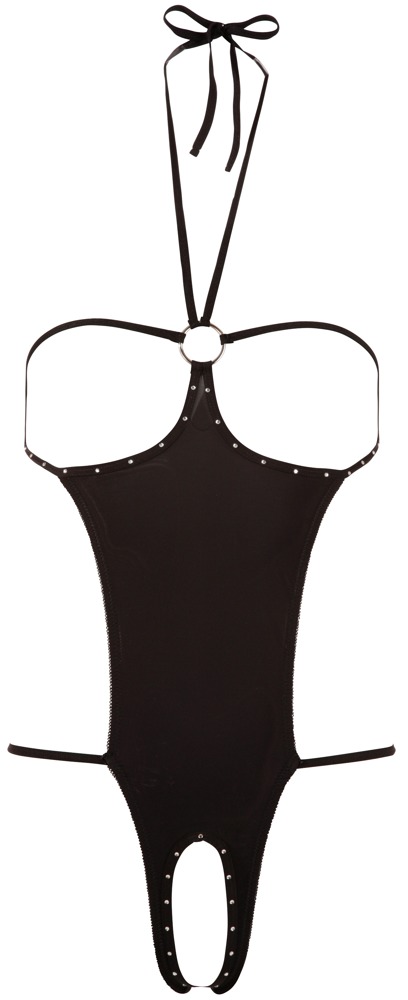 Seksowny jednoczęściowy garnitur z uchwytem na szyję do wiązania i ozdabiania dżetów na otwartych miseczkach i otwartym kroczu. Z tyłu tylko stringi. Czarny. 85% poliamid, 15% spandex.