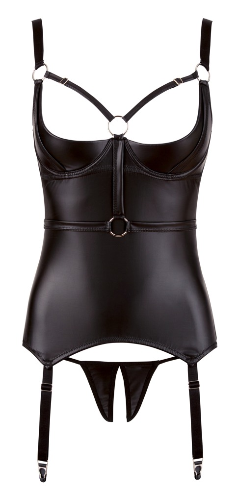 A beautiful but strict look and soft, comfortable material – fits like a second skin! Underwired cami suspender in a matte black look with metal details. With adjustable straps over the naked breasts, a strap over the stomach and handcuffs with hook and loop fasteners at the back. The bra straps and 6 suspender straps are adjustable. Includes a crotchless string. 90% polyester, 10% spandex. Without stockings.