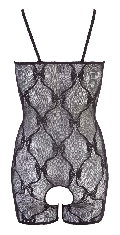 Seksowny, krótki kostium tylko z nogawkami, prowokująco otwarty w kroku i na biuście. Wykonane z czarnej, elastycznej koronki. Cienkie paski. Dołączone mankiety na ramiona.