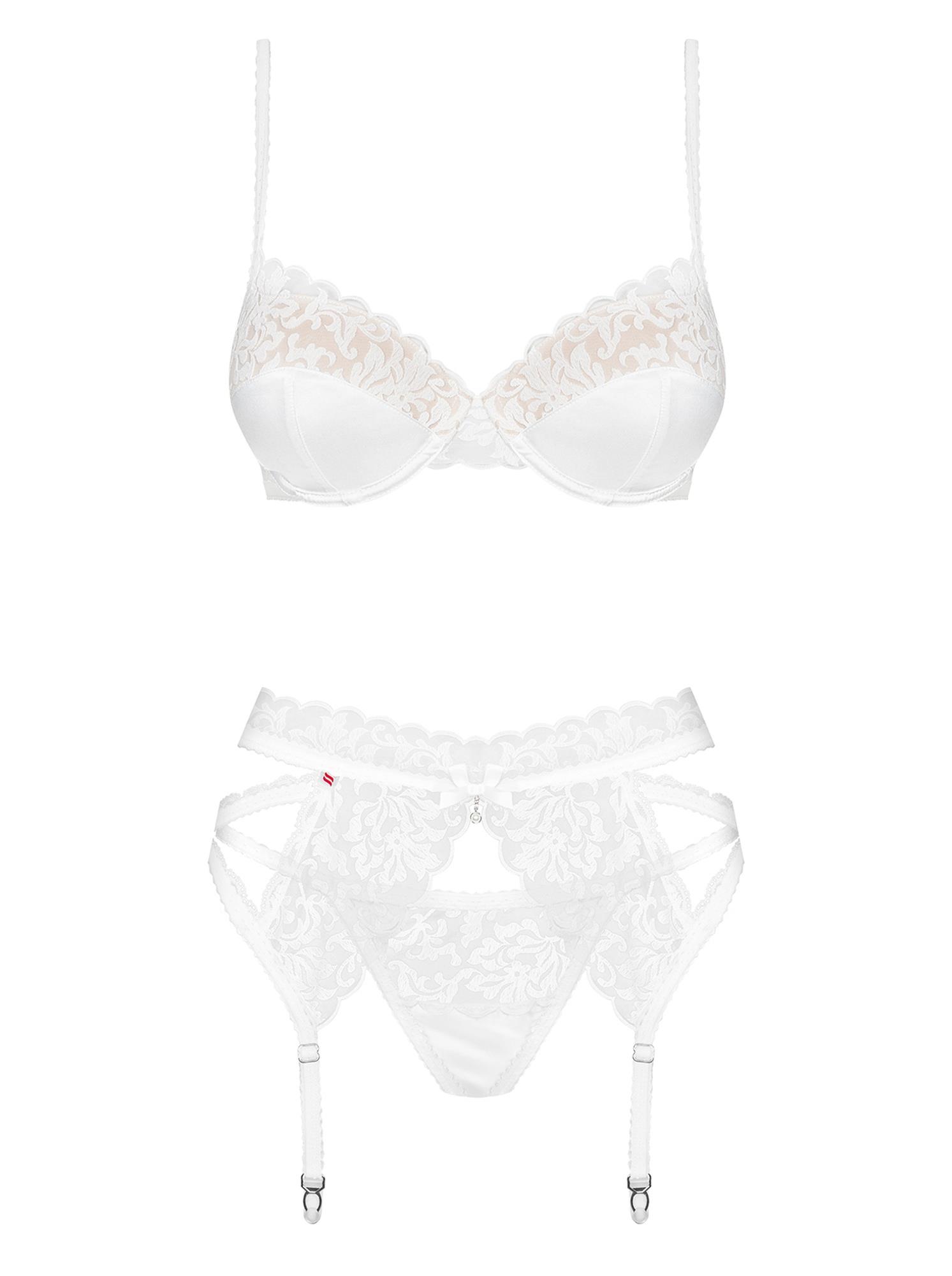 Biała bielizna w wersji super sexy? Przygotowaliśmy dla Ciebie wyjątkowy model! Zjawiskowy komplet składający się z eleganckiego biustonosza, ślicznych stringów i boskiego pasa do pończoch. Chcesz oczarować swojego faceta fantastycznym wyglądem? Pomogą Ci w tym seksowne paski, delikatna perełka i fikuśna kokarda tuż nad pośladkami!
