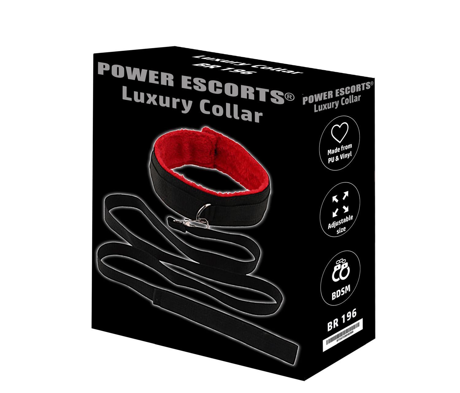 Power Escorts – BR196 – Luksusowa obroża – Kinky Collar – Bondage – BDSM – Czarnyczarno czerwona obroża ze smyczązapakowane w atrakcyjne kolorowe pudełko
