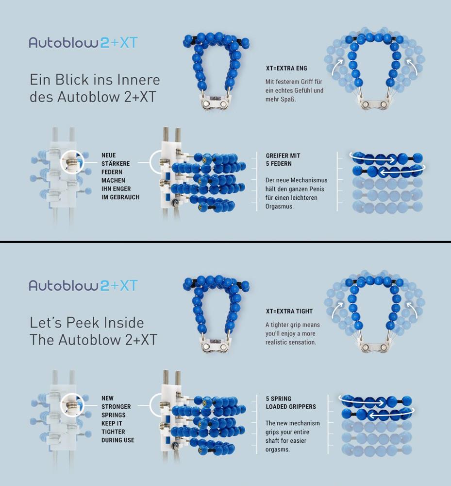 50% ciaśniejszy niż model Autoblow 2+.5 ramion masujących (sprężyn) obraca się wokół wałuBardzo mocny i wytrzymały silnik wysokiej jakościW pełni automatyczny masaż w ruchu w górę i w dółW wytrzymałej obudowie znajduje się silnik, który rytmicznie porusza sprężyny w górę i w dół. Tuleja na penisa jest umieszczana w obudowie tak, że sprężyny znajdują się wokół rękawa. Tuleja z otworem w kształcie ust jest odpowiednia dla WSZYSTKICH długości penisa.Bez ftalanów zgodnie z rozporządzeniem UEUżywać z lubrykantem.Uwaga: Autoblow automatycznie wyłącza się, gdy robi się zbyt gorąco lub jest zbyt duże ciśnienie.
