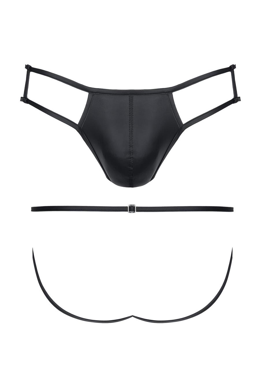 Męskie stringi z wetlooka z otwartym tyłem i elementem dekoracyjnym s