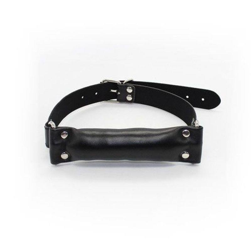 Czarny knebel w kształcie paska wzmocniony nitami.