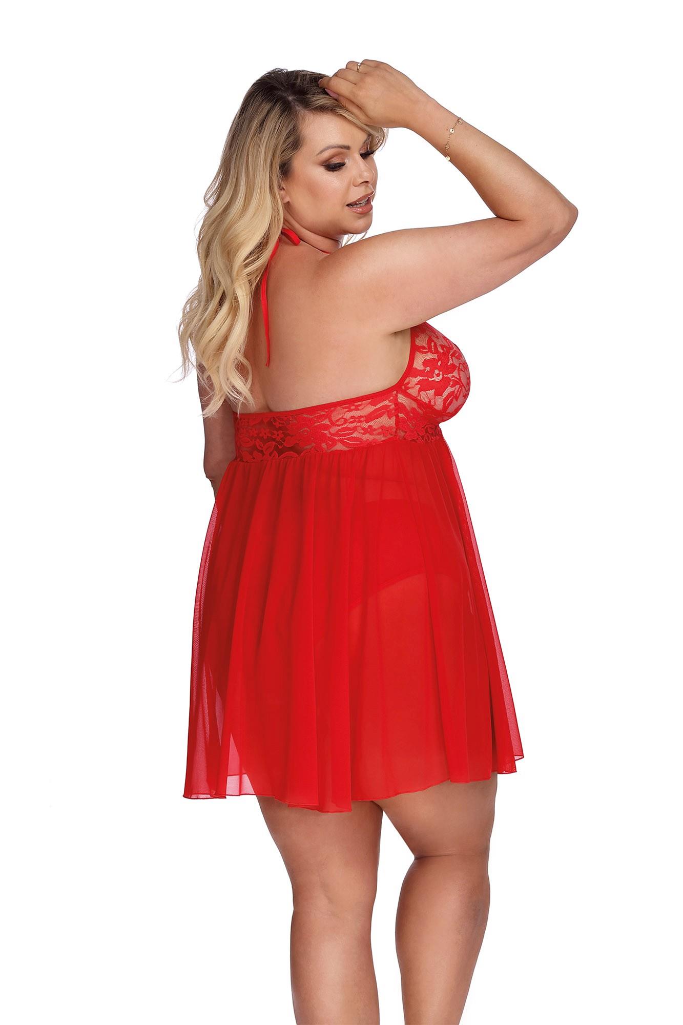 Jednoczęściowa czerwona haleczka wiązana na szyi gwarancją perfekcyjnego dopasowania – delikatny szyfon nadający lekkość całej stylizacji – stanik uszyty z miękkiej koronki – dostępna w rozmiarach: L+, XL+, XXL+