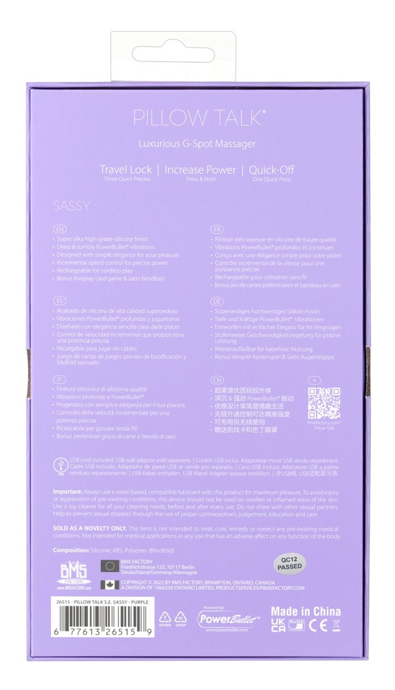 Special Edition: Vibrator Sassy incl. a card game & a satin scarf! The Special Edition Sassy from Pillow Talk is extremely seductive. An exciting couple’s card game with foreplay inspiration and a high-quality satin scarf come with the popular Sassy vibrator. The scarf can be used as a blindfold or as restraints for captivating moments. The stylish vibrator pleasures the vagina intensely with its stimulating raised grooves on the shaft. Its wonderfully curved head can be used to provide spot-on G-spot pleasure. The velvety soft touch surface means that the vibrator slides in almost on its own. The powerful power bullet motor provides deep, shaking vibrations for exciting stimulation. The vibrations can be controlled gradually and precisely at the push of a button. The control button sparkles thanks to its beautiful Swarovski® stone! Other highlights are the Press & Hold function that increases the power, the Quick-Off function that turns it off immediately and the practical travel lock. It can be recharged with the included USB cable. Vibrator: Complete length 20 cm, Ø 3.8 cm. Silicone. Satin scarf: 100% polyester.