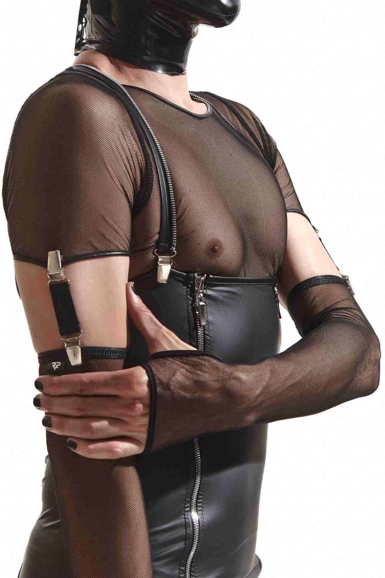 Długie rękawiczki wykonane z czarnej, elastycznej siateczki. Sięgające od połowy dłoni za łokieć. Dodatkowe wycięcie na kciuk. Świetnie dopasowują się do dłoni i przedramion, podkreślając i ukazując ich kształt. Dodatkowo w zestawie są elastyczne paski ze srebrnymi, metalowymi zapięciami. Służą do przypinania rękawiczek do koszulki – dzięki czemu rękawiczki nie zsuwają się i efektownie się prezentują. Zapięcia pasków są trwałe, metalowe i wodoodporne. Produkt sprzedawany w pudełku z logo RFP – bez spersonalizowanego zdjęcia.