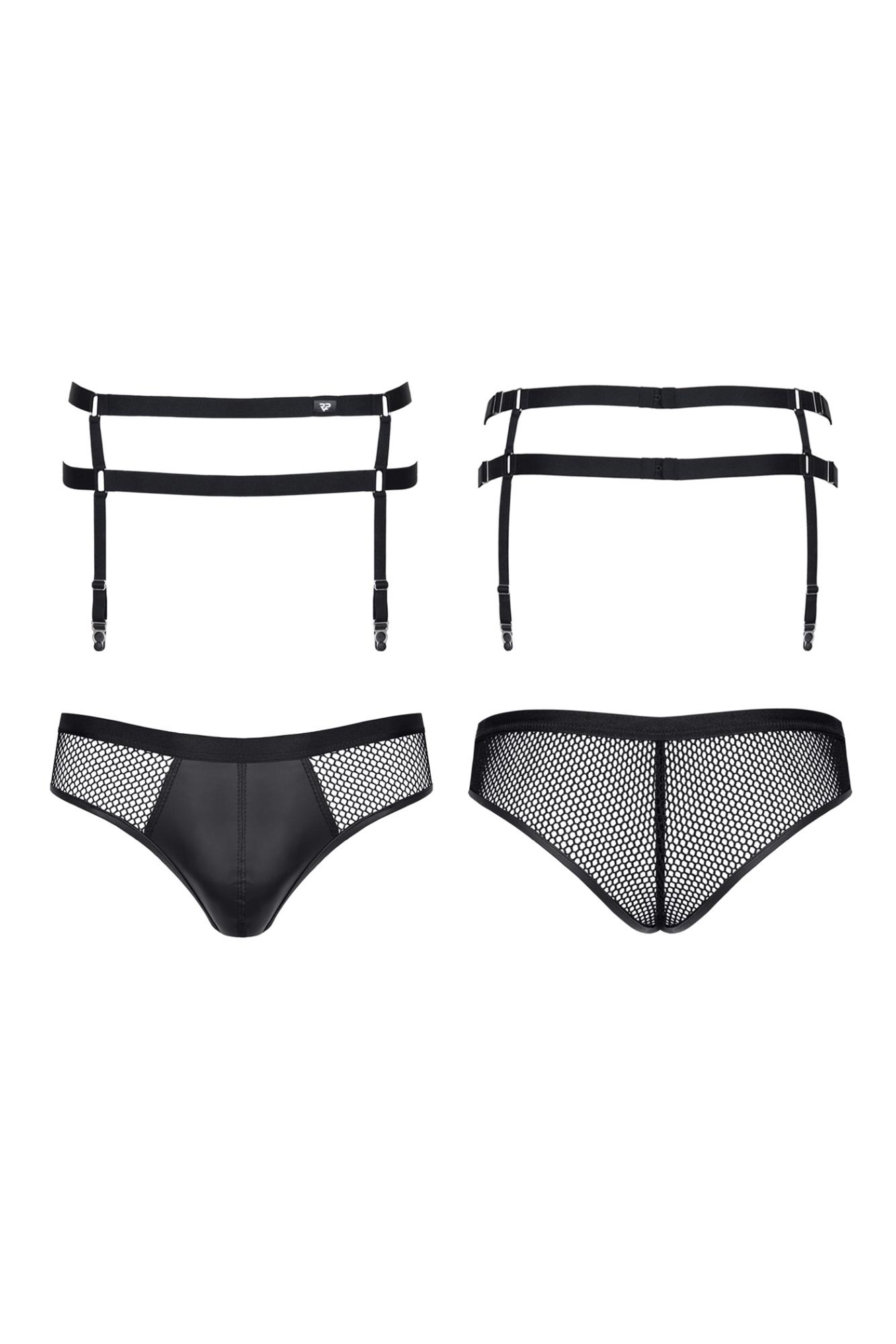 Pas do pończoch. Zestawienie miłych w dotyku gumek w kolorze czarnym z efektownymi ozdobnymi elementami. Geometryczne połączenie gumek stanowi atrakcyjną wizualnie propozycję. Zapinki do pończoch metalowe w kolorze srebrnym. Z tyłu 2 zapięcia z regulacją 2-u stopniową. Paski do pończoch ze srebrnymi regulatorami ułatwiającymi dopasowanie. Majtki z przodu z czarnego elastycznego wetlook”a, z boków i tyłu z miłej w dotyku, elastycznej siateczki. W środku kieszonka z BigBossEffect. Pięknie prezentują się na pośladkach oraz apetycznie ukazują ich wygląd przez oczka siateczki.