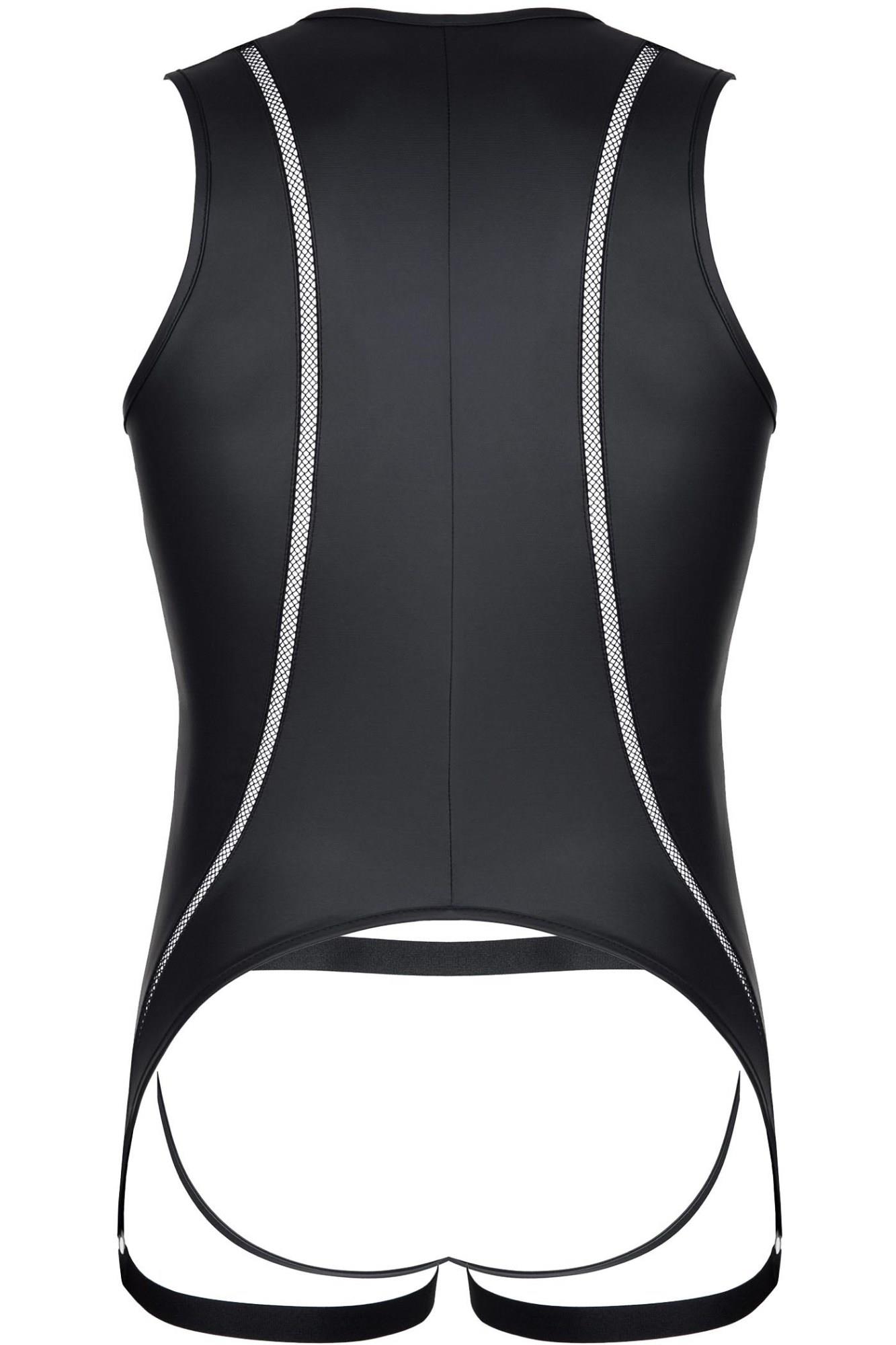 Body: Efektowne z czarnego wetlook”a. Z przodu po bokach pionowe elementy dekoracyjne z czarnej siateczki. Ekspres z przodu zapinany dwustronne z ozdobnymi suwakami. Body po bokach, u dołu kończy się poniżej linii pośladków paskami z czarnej, miłej w dotyku gumki z metalowymi regulatorami. Z tyłu kolisty kształt apetycznie i zmysłowo ukazuje nagie pośladki. Majtki typu jockstrap. Z przodu ozdobne siateczki po bokach. Na obwodzie bardzo miła, czarna gumka z metalicznym połyskiem. Dolne paski body, będące na udach oraz tylne paski od majtek efektownie podkreślają kształt nagich pośladków.