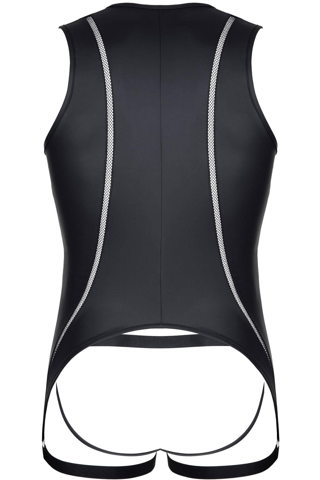 Body: Efektowne z czarnego wetlook”a. Z przodu po bokach pionowe elementy dekoracyjne z czarnej siateczki. Ekspres z przodu zapinany dwustronne z ozdobnymi suwakami. Body po bokach, u dołu kończy się poniżej linii pośladków paskami z czarnej, miłej w dotyku gumki z metalowymi regulatorami. Z tyłu kolisty kształt apetycznie i zmysłowo ukazuje nagie pośladki. Majtki typu jockstrap. Z przodu ozdobne siateczki po bokach. Na obwodzie bardzo miła, czarna gumka z metalicznym połyskiem. Dolne paski body, będące na udach oraz tylne paski od majtek efektownie podkreślają kształt nagich pośladków.