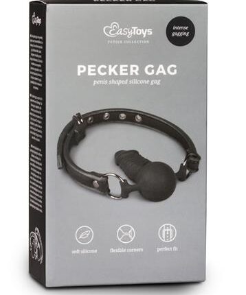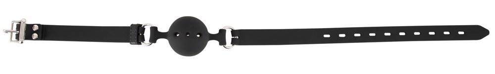 Czarny knebel z otworami do oddychania i regulowanym paskiem.