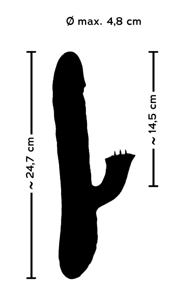 Intense thrusting and rotation fun! This rabbit vibrator provides stimulation with its powerful rotation and thrusting function in 3 different modes. The numerous rotating beads in the shaft provide unparalleled pleasure. The clitoral stimulator has 'tongues’ and dots that stimulate the pearl of pleasure with intense vibrations in 10 modes. The shaft is also a great pleasure-giver with its stimulating texture and pronounced glans. Complete length 24.7 cm, insertion length 14.5 cm, Ø 4.8 cm. Silicone, PU, ABS.