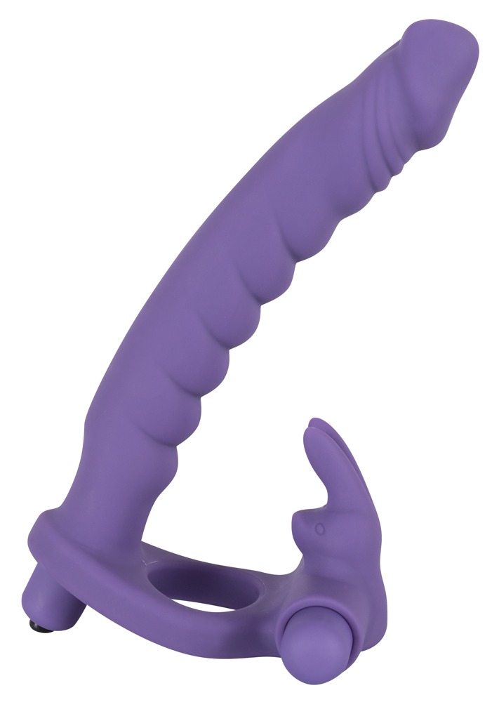 Stymulator łechtaczki i wibrator są przymocowane do pierścienia penisa, który jest w środku pomiędzy dwoma.