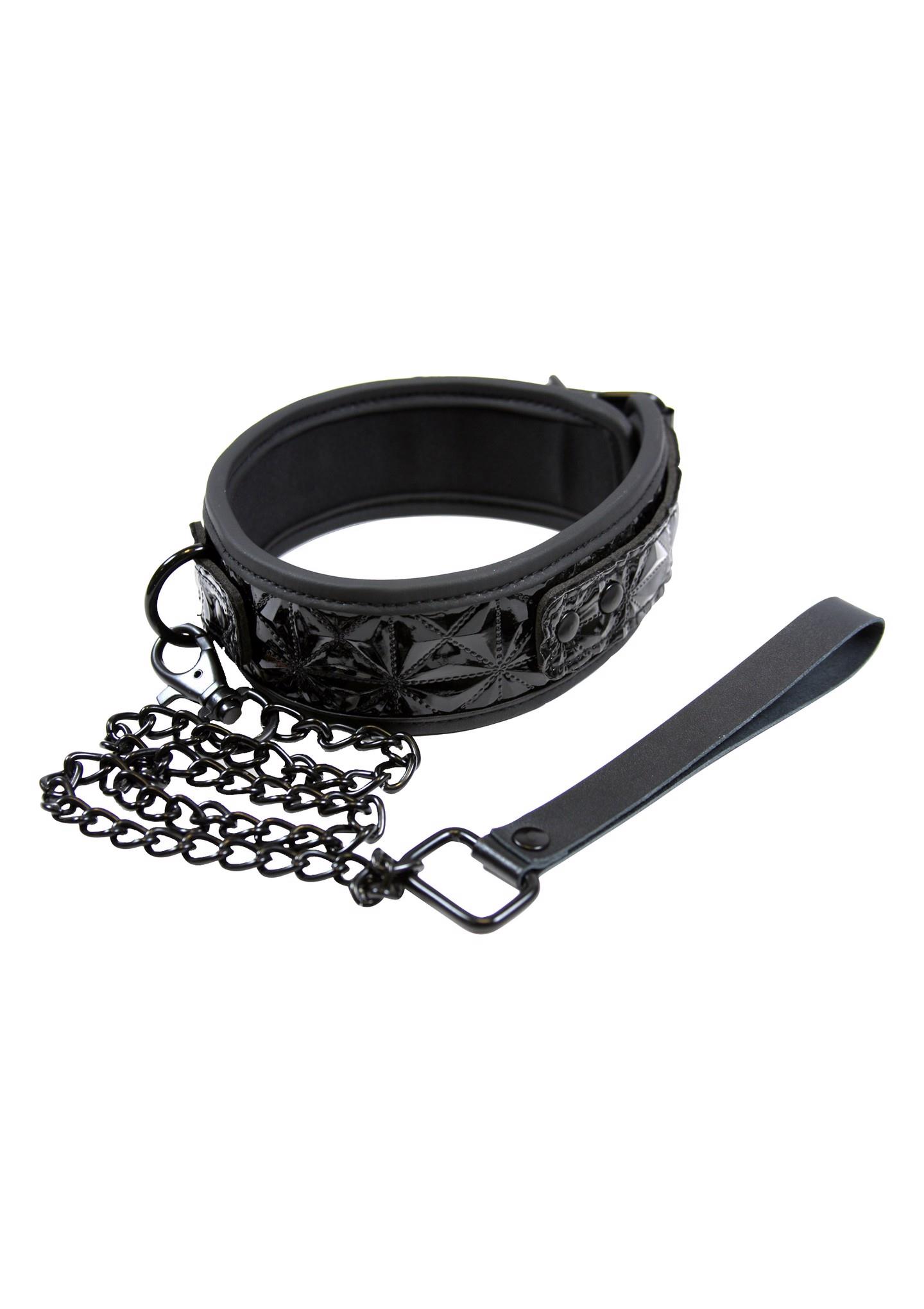 SINFUL COLLAR – ciężka smycz z obrożą dla podkreślenia ról w dominacji i uległości z uwodzicielskiej serii. Smycz zakończona metalowym karabińczykiem pozwoli Ci skutecznie pokierować Twoim/ją Uległym/ą. Regulowana obroża z metalowym rozłączanym kółkiem stanowi także dodatek estetyczny. Ograniczając swobodę poruszania się Uległego jesteście w stanie nawiązać dużo bardziej intymną więź przez budowanie obustronnego zaufania.Zarówno uchwyt smyczy jak i obroża wykonane są z bogato zdobionej tkaniny o subtelnym połysku.