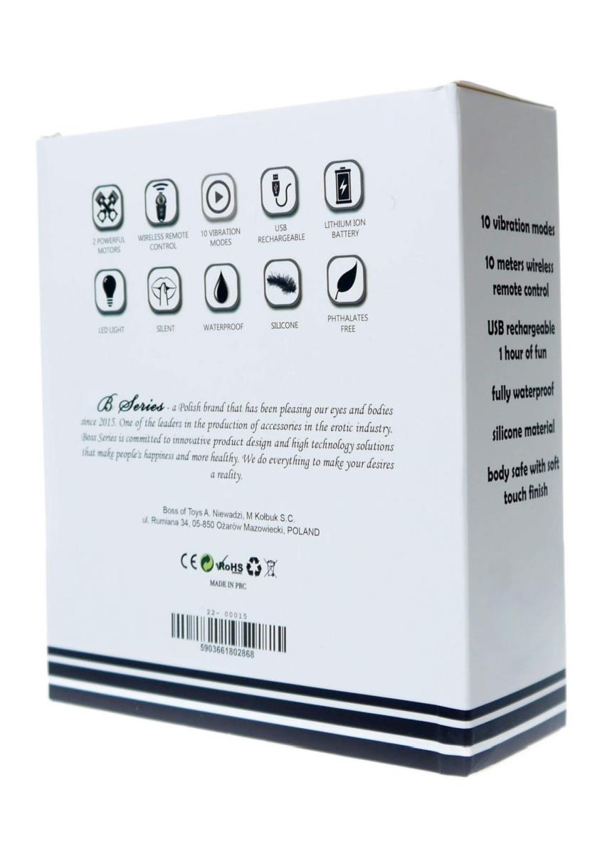 - Sterowanie odbywa się za pomocą bezprzewodowego pilota co pozwala na jednoczesną stymulację krocza i prostaty bez użycia rąk